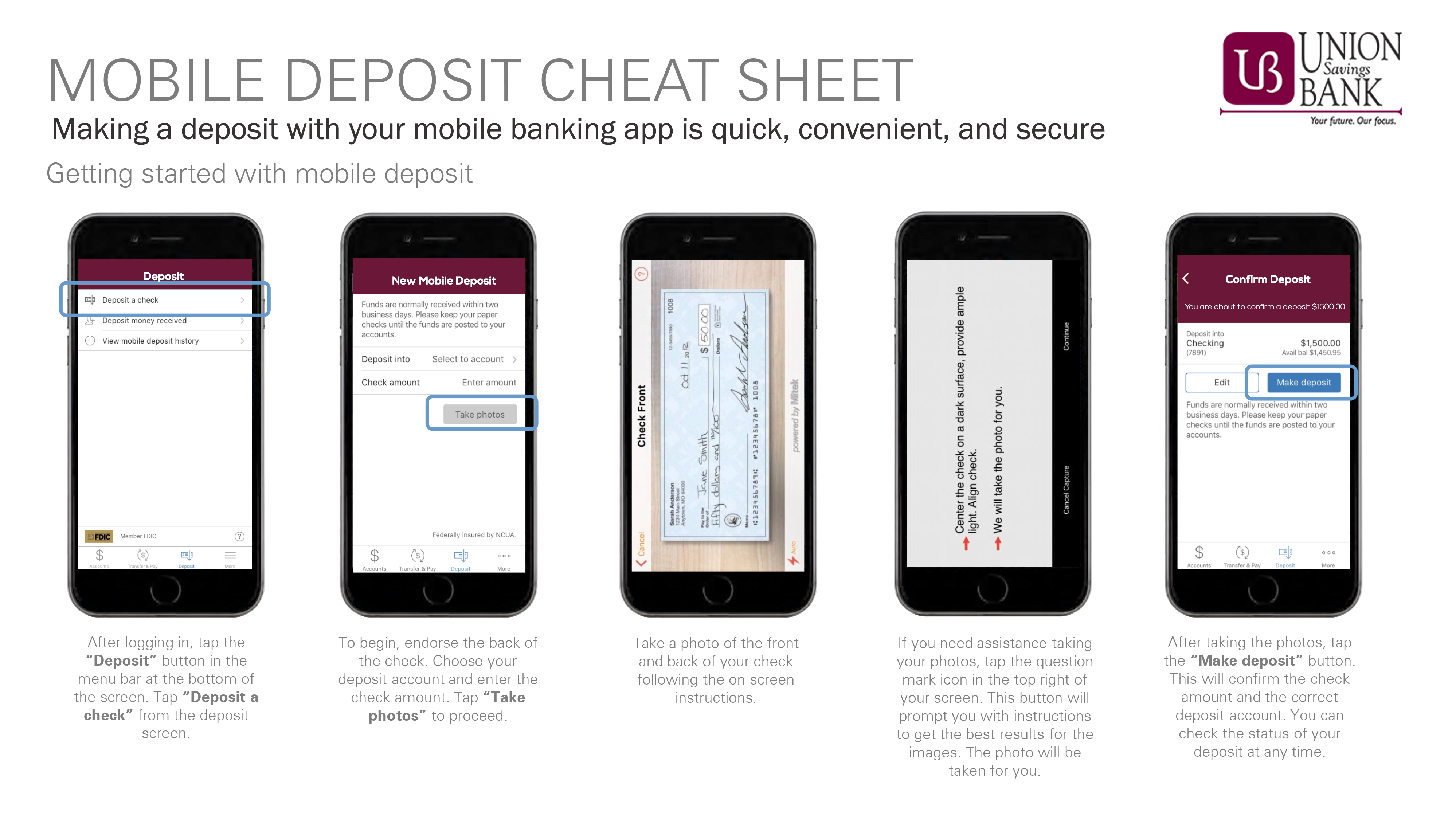 - Endorse the check's by signing your name and the statement "For Mobile Deposit Only at UNION Savings BANK".